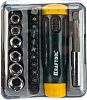 Набор Kraftool Bit-Lock-18 26143-H18 содержит 18 предметов: реверсивную отвёртку, 9 бит, 6 торцевых головок и 2 адаптера. Инструмент и оснастка расположены в многоразовом пластиковом кейсе.