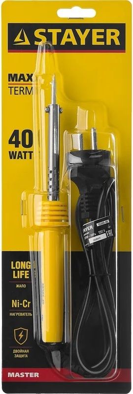 Электропаяльник 40 Вт с пластиковой рукояткой Stayer MAXTerm серии Master 55305-40 применяется для монтажа электронных компонентов на печатную плату, для пайки и лужения медных проводников сечением до 1 мм². Высококачественный нагревательный элемент, выполненный из нихрома, позволяет нагреть жало до необходимой температуры за считанные минуты. Паяльник оснащен медным жалом со специальным покрытием LongLife, обеспечивающим качественную пайку и долгий срок службы.